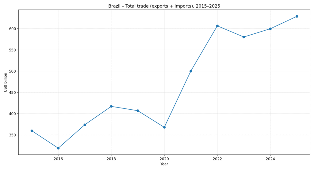 Brazil’s total trade flow — the sum of exports and imports — reached US$ 629.06 billion in 2025. Over the last decade (2016–2025), total trade amounted to US$ 4.80 trillion, an increase of 27.0% compared to the previous decade (2006–2015). By comparison, in the first decade of the 2000s (2001–2010), total trade stood at just US$ 2.24 trillion.